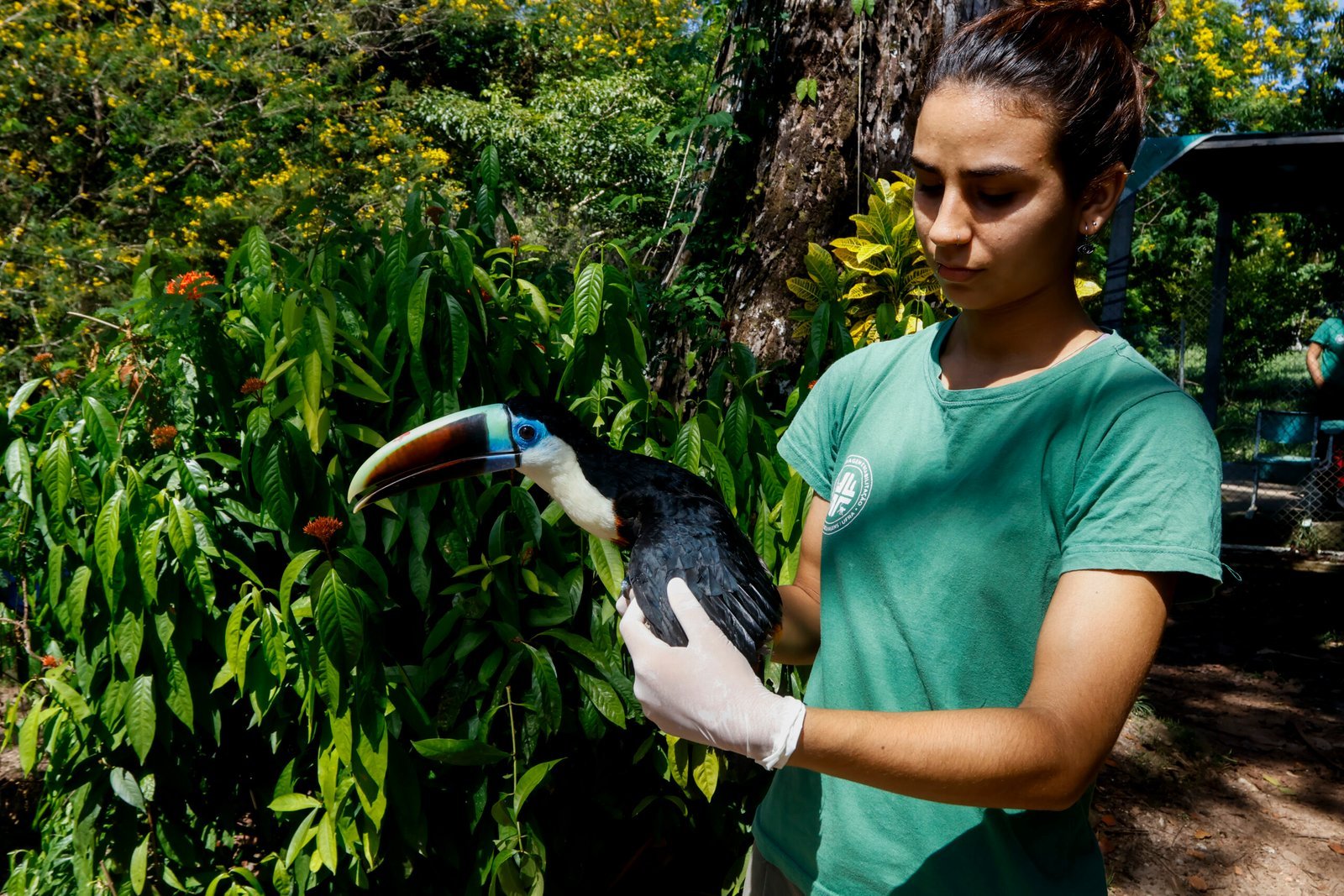 Veterinarian Caroline Sotto holds a rescued toucan with its wing feathers clipped at CETRAS/UFRA (Wild Animal Screening and Rehabilitation Center). Photo: Oswaldo Forte.