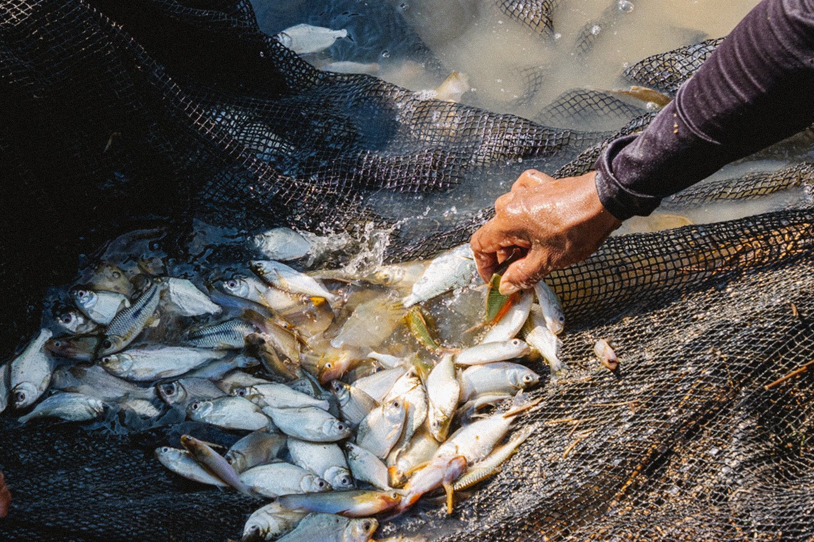 Denis dropped me off on the bank with the canoe and climbed onto the larger boat to help Jimmy and Preto. Together they lifted the arrastrón, a 25-meter black seine with one-centimeter mesh. Jimmy grabbed one end and jumped into the water while Denis held the other from the boat. Slowly, Preto maneuvered the vessel, so the seine encircled a section of the creek where the ripples were densest. Once he completed the semicircle, he used an oar to pin one end of the net to the shoreline and drag it toward firm ground.