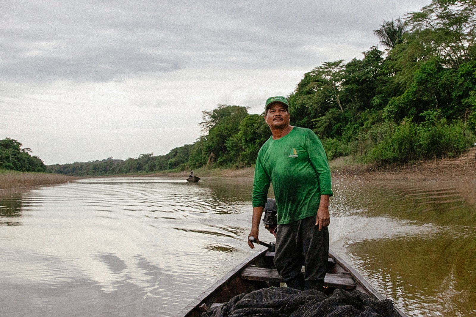We set off in search of the fish on the morning of September 2. The sun beat down on the sepia waters of the Amazon River as we left behind the Leticia Aquarium, the collection center run by the Dos Santos family, among the first in the city to fish for ornamental species. We traveled in a seven-metre wooden canoe—barely a metre and a half wide—sitting on three planks. At the bow, Alexander Valencia Dos Santos—a 45-year-old fisherman everyone in the area calls Jimmy—signaled to Robinson Rodríguez Do Nascimiento, a 34-year-old Brazilian nicknamed Preto, who steered from the stern with the peque peque, a small outboard motor with the power of a lawn mower. The fishing gear—traps, baskets, nets—the bags, and blue plastic sheets meant to create makeshift tanks inside the canoe for the otocinclus, were piled in the middle, just in front of a third bench where I struggled to settle in.